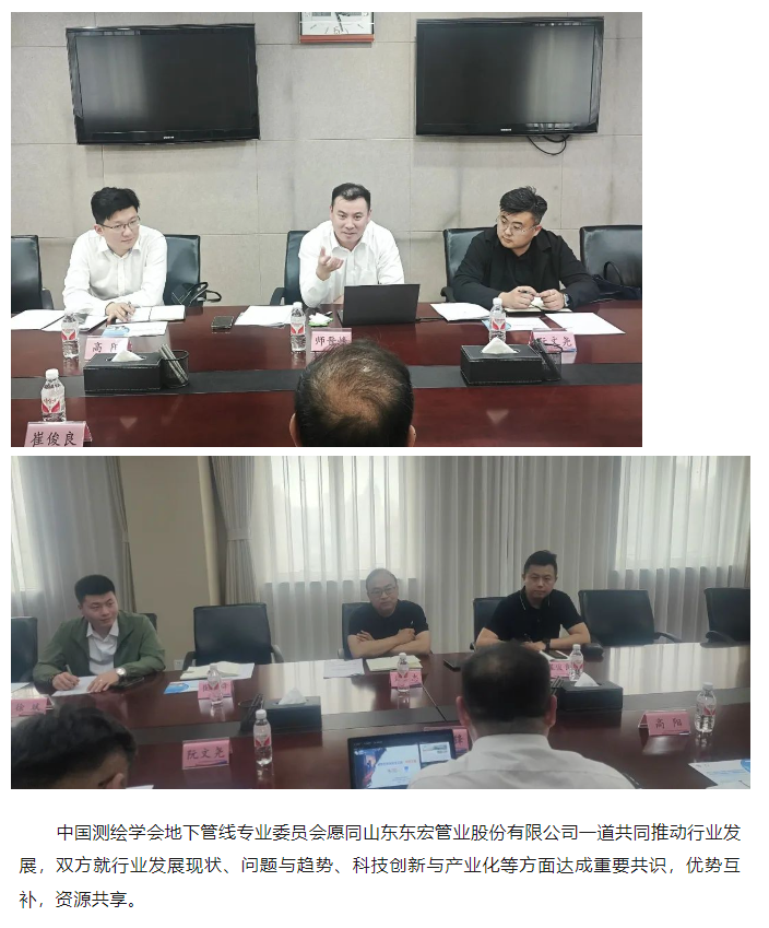 5月9日,山東東宏管業(yè)股份有限公司副總經(jīng)理、城市生命線產(chǎn)業(yè)發(fā)展(曲阜)有限公司董事長師晉鋒、城市生命線產(chǎn)業(yè)發(fā)展(曲阜)有限公司副總經(jīng)理阮文堯、山東東宏管業(yè)股份有限公司北京區(qū)域銷售經(jīng)理高陽一行來到中國測繪學(xué)會地下管線專業(yè)委員會(以下簡稱“地下管線專業(yè)委員會”)進(jìn)行交流探討,地下管線專業(yè)委員會常務(wù)副秘書長劉會忠,外聯(lián)部主任崔俊良,會展部副主任崔希舜和徐斌出席參加交流座談。